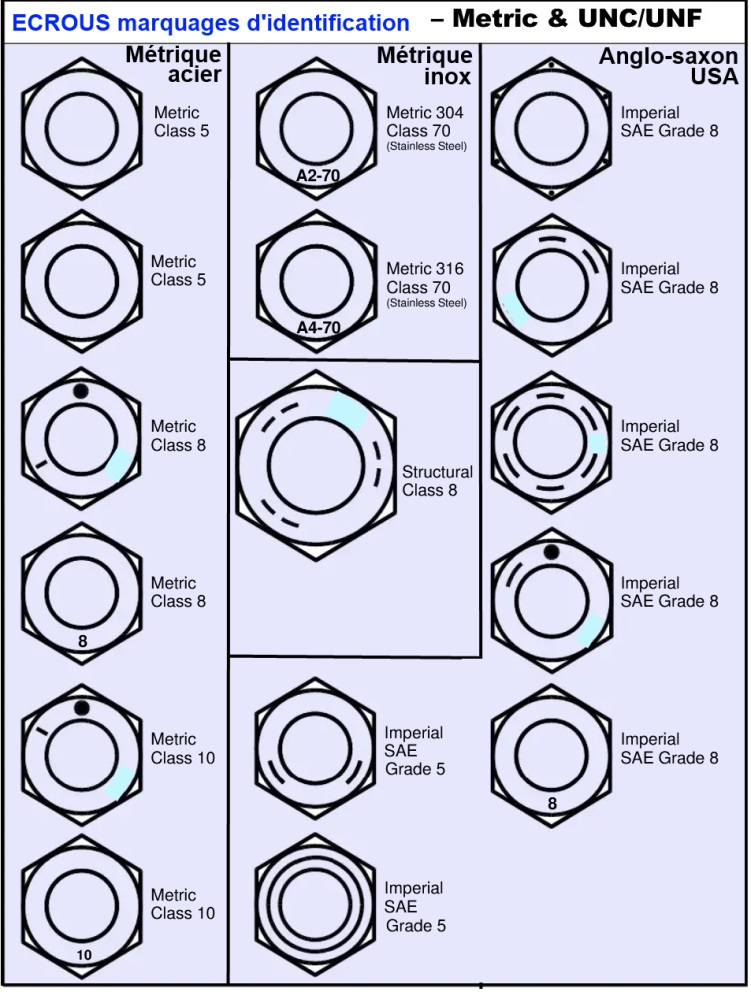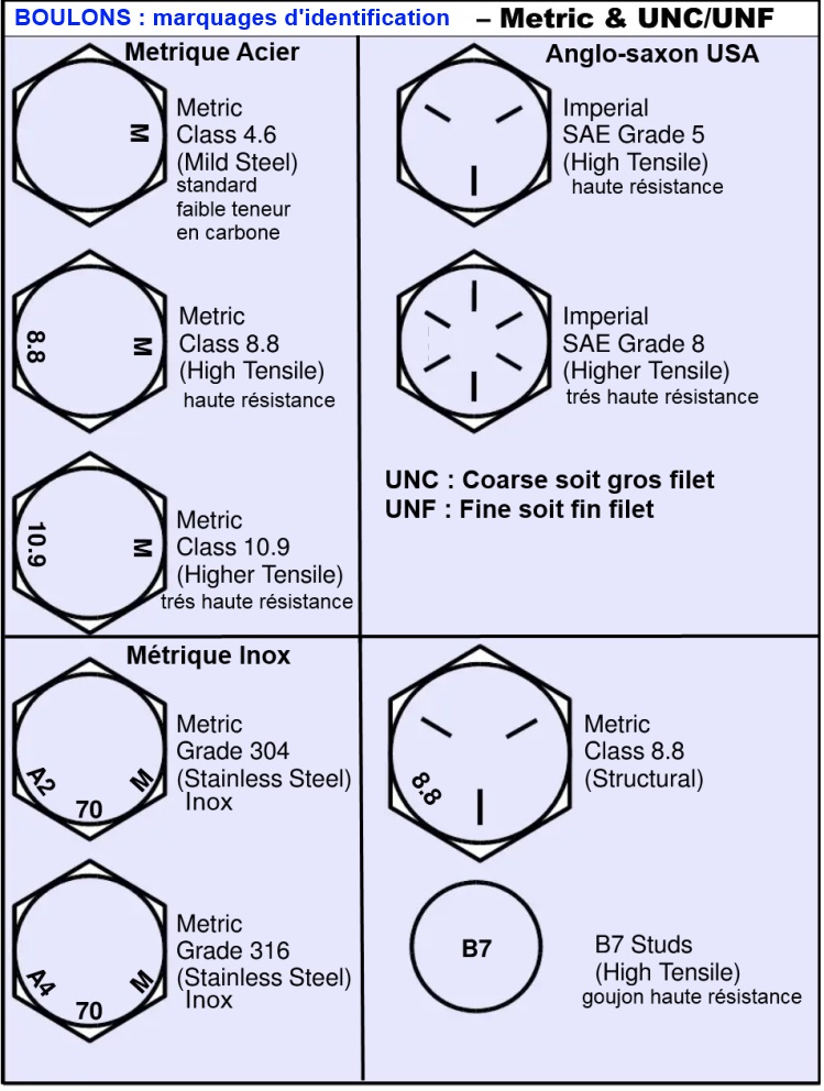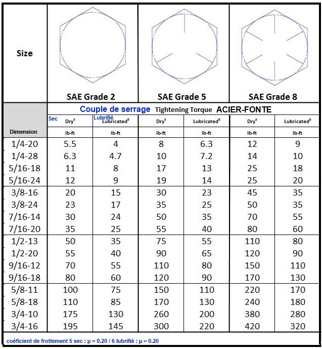 Un tableau pour les valeurs de couples recommandés en fonction de la qualité de résistance et de la dimension (voir aussi notre dossier boulonnerie ). Identifier la résistance de votre boulon ( Europe ou USA suivant marquage ) puis identifier sa dimension. La résistance : en Europe on parle de classe (4.6, 8.8, 12.9 ) aux USA de grade (2, 5, 8, ...). Les dimensions : en Europe on parle en mm ( M2 = 2 mm ) , aux USA on parle en pouce ( 1 pouce = 25.4 mm donc 1/4 = 1/4 de 25.4 = 6.35 mm ). |