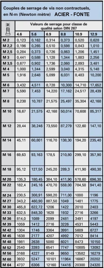 | 6-PAS DE VALEURS CONSTRUCTEURS ? DES VALEURS SUIVANT QUALITé BOULON EUROPE - USA. UNIQUEMENT SERRAGE SUR ACIER ET FONTE , PAS POUR L'ALUMINIUM (sinon arrachage filet).