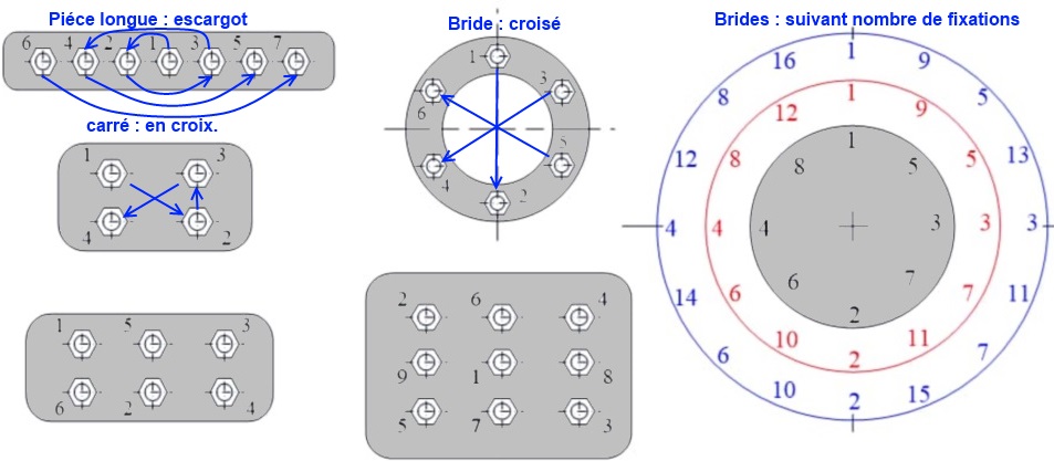 Attention on ne serre pas dans n'importe quel ordre et surtout pour les culasses. Sur collecteurs ou sur culasse au montage on tourne en escargot du centre vers l'extérieur. Au démontage inversement , de l'exterieur vers l'intérieur. On peut avoir des serrages en plusieurs passes : pré-serrage 20 , serrage 50 puis 1/4 de tour. Sur d'autres piéces c'est suivant la forme mais souvent serrage en croix (croisé). |