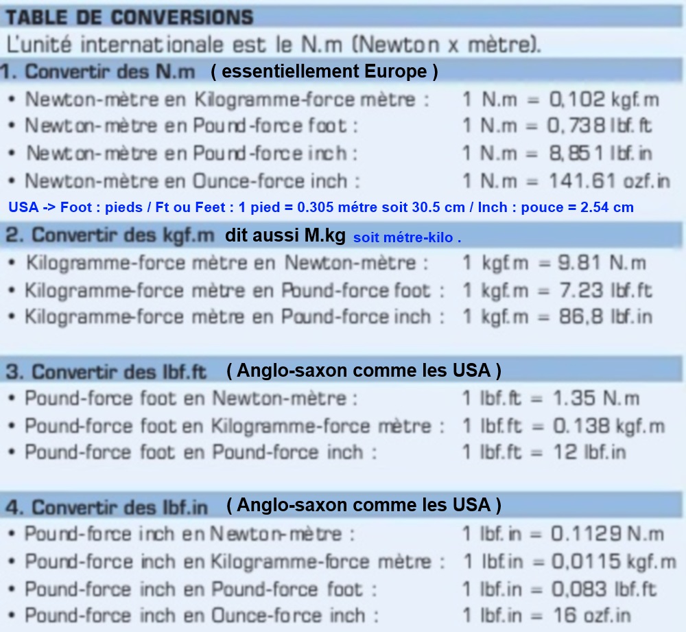 Pour l'Europe on parlera en Métre-kilo (Mkg) ou de Newton-métre ( Nm ) voir de déca-newton ( daN : 1 déca = 10 N-métre ). Pour les pays Anglo-saxons on parlera de Pound feet (pied-livre) indiqué en Lbs-ft ou Ft-lbs ( feet : 1 pied , foot : plusieurs pieds / lbs : livres ). Chez eux la base est le pouce 25.4 mm puis le pied qui équivaut à 12 pouces soit 30.48 cm. Il éxiste des tableaux d'équivalences entre unités. Pour le serrage angulaire : soit on parle en tour 360° (turn en anglais, 1/4 = Quarter turn, 1/2 Half turn, ...) , soit directement en degrés ( 90° = 1/4 de tour / 180° = 1/2 tour ). |