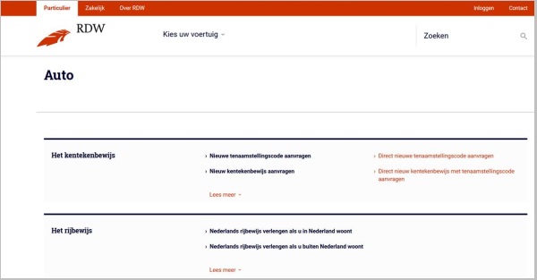 L'organisme de gestion des véhicules est le RDW (Rijksdienst Dienst Wegverkeer) , sur https://www.rdw.nl/particulier/voertuigen/auto Le CT / et le rapport de CT s'appellent : MOT / APK Keuringsrapport . Se fait 4 ans après le neuf puis tous les 2 ans. La demande d'un rapport de l'historique (non testé) du véhicule ( Tellerapport aanvragen ) est consultable avec un code de sécurité Digid que l'on peut obtenir sur www.digid.nl , puis avec se rendre sur https://www.rdw.nl/particulier/voertuigen/auto/tellerstanden/tellerrapport-aanvragen |