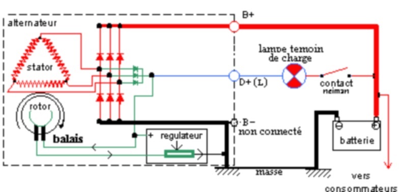 La particularité des dynamos et alternateurs et de produire la puisssance juste nécéssaire au systéme: pas assez on ne rechargera pas la batterie mais trop et on risque la destruction. Donc on aura une régulation de puissance (P) et comme P = U x I on régulera de la tension (U) et de l'intensité (I) . Pour réguler on va créer une induction ou excitation variable ( l'équivalent des aimants qui balayent les bobines ) pour récupérer plus ou moins de d'électricité. On peut varier coté négatif ou coté positif . Pour la dynamo c'est au stator, ce sera une technologie externe (régulateur séparé) et basé sur du relais (une bobine attire plus ou moins un noyaux ). C'est du tout ou rien: on charge ou on ne charge pas. De plus on aura des limiteurs de tension (U) et de courant (I) et même une protection générale par coupure. |