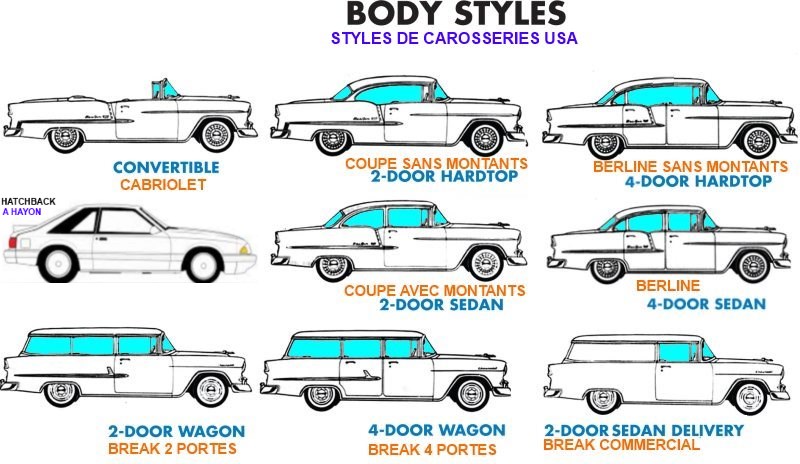 | CAS DES PORTES: Comme pour les fenêtres on peut compter les portes pour parler d'une voiture. Sauf que là aussi des choses ne comptent pas: le capot moteur et la malle. Donc sur un coupé on aura 2 portes ( 2 DOORS ou TWO DOORS) et sur une berline on aura 4 portes ( 4 DOORS ou FOUR DOORS ). Sur un coupé corvette qui n'a pas de malle ce sera aussi un coupé 2 portes. La malle peut être standard ou à hayon (HATCHBACK) sur berline (SEDAN) ou coupé. | |||||||||||||||||||||||||||||||||||||