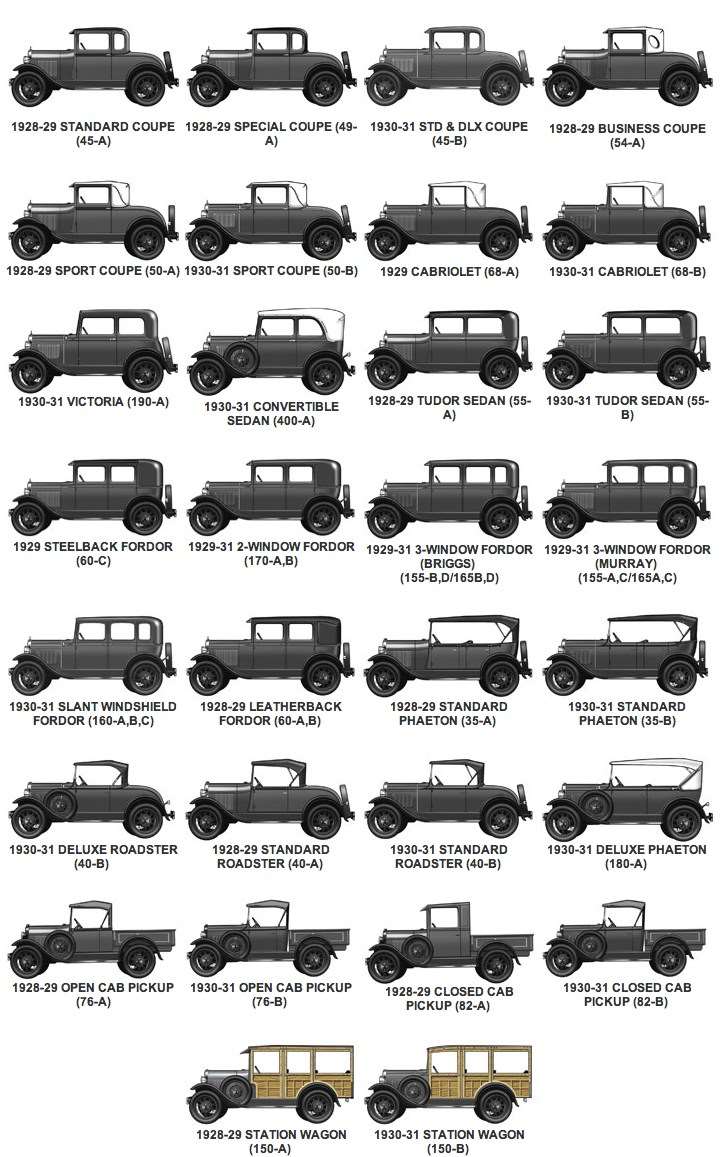 | BODY STYLE : Les styles de carosseries pour les voitures sont définis par: le nombre de porte, les montants, parfois la forme de la malle (hayon FASTBACK). Pour les anciennes il y avait beaucoup de styles définis pour des différences mineures(exemple avec les FORD A). Entre europe et USA des appelations différentes existent pour un même style de carosserie .