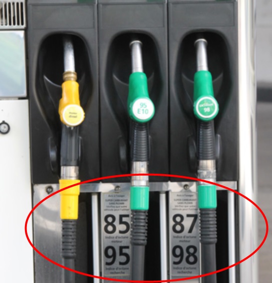 Donc on test le carburant dans un moteur de mesure à essences pour déterminer par comparaison l'indice d'octane ou taux d'octane (sa résistance ): à 600 tr/mn détermine l'indice RON (indice recherché ) puis à 900 tr/mn détermine l'indice MON (indice moteur ), plus il est élevé et plus il tient la pression. Cela donne un indice chiffré qui correspond au nom des essences, on peut le lire sur les pompes à essences. |