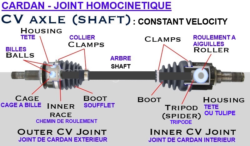 Le cardan ne date pas d'hier, inventé en 1545 par le mathématicien italien Girolamo, on l'appelle de différentes façons : cardan, joint de cardan, joint homocinétique, .... . En anglais on parle de CV pour Constant Vélocity ( vitesse constante) qui reprend le sens du terme homocinétique ( homo : même et cinétique : vitesse ). On y ajoute les termes de drive (transmettre) et axle ( arbre ) . Le but est de transmettre un mouvement de rotation quelque soit la vitesse du véhicule, le relief qu'il traverse, quelque soit sa trajectoire, entre une boite de vitesse fixe et une roue sur moyeu mobile ( hauteur et angle).