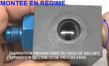 Par sécurité un gros gicleur fixe " principal maxi " permet d'avoir une protection sur la ligne, si ouvert maxi alors purge maxi donc pression mini de sécurité. Parfois appelé " économy bypass ". Le principal maxi donne une pression basse sur la ligne (grosse purge) puis sur le sélecteur on choisi un gicleur plus petit " richer " (diminution purge) et la pression monte. |