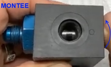 | Mais dans le cas des haut régimes le bypass principal sera grand ouvert et dépassé par le volume de la pompe continuant d'augmenter. Dans ce cas un bypass supplémentaire s'ouvre sur un seuil de pression pour évacuer le surplus de débit, le high speed bypass. Il comporte une entretoise interchangeable sur le ressort permettant de choisir à quelle pression il s'ouvre et un gicleur (Poppet ou Jet) dimensionnant le débit max évacuable. | ||||||||||||||||||||||||||||||||