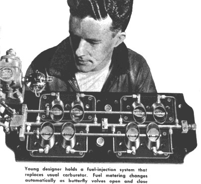 | Aprés les carburateurs mais avant l'apparition des 1éres injection constructeurs automobiles USA et avant les injections électroniques des annéees 80-90, il y a eu l'apparition des injections mécaniques de préparateurs dans les années 40 d'abord sur Ford flathead puis GM, FORD et MOPAR . Les systèmes d'injection mécanique USA à débit permanent sont fondamentalement destinés à la compétition et sont tous constitués des mêmes éléments dont les cornets à papillon si caractéristiques. Les stack mécanical fuel injection ( injection d'essence mécanique à cheminée). | ||||||||||||||||||||||||||||||||