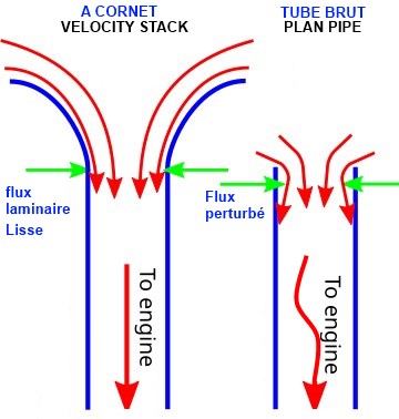 | Le collecteur d'admission, les cornets, quelques réglages : les cornets permettent d'avoir un flux d'air aspiré le moins perturbé possible. Pour les papillons il y a un banc maitre, un esclave relié par une tringle réglable pour la synchronisation et un renvoi au bloc de dosage. L'ouverture minimale de papillon se régle à la cale, la synchro papillon bloc doseur se régle d'abord puis la richesse au ralenti. | ||||||||||||||||||||||||||||||||