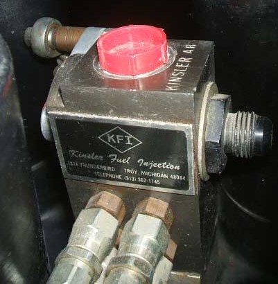| Le bypass principal est une restriction controlée grace à un gicleur calibré (Poppet ou Jet), et une soupape de décharge grace à un clapet à ressort. Positionné à la sortie pompe vers bloc doseur : plus on purge plus la pression baisse, moins on purge plus la pression augmente. On crée une pression stabilisée du ralenti au 3/4 de régime moteur. Le gicleur est interchangeable et sa taille est choisie pour fournir suffisamment de débit carburant à pleine charge (WOP : Wide Open Throttle : pleine ouverture papillon). Chez Kinsler on peut même avoir un changeur de gicleur sans démontage : le Jet selector. | ||||||||||||||||||||||||||||||||