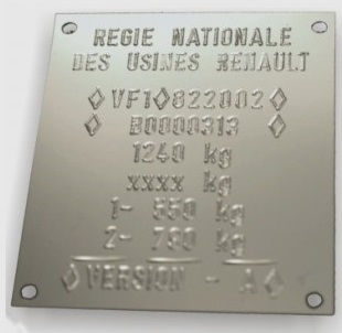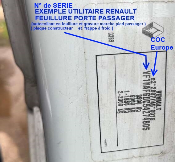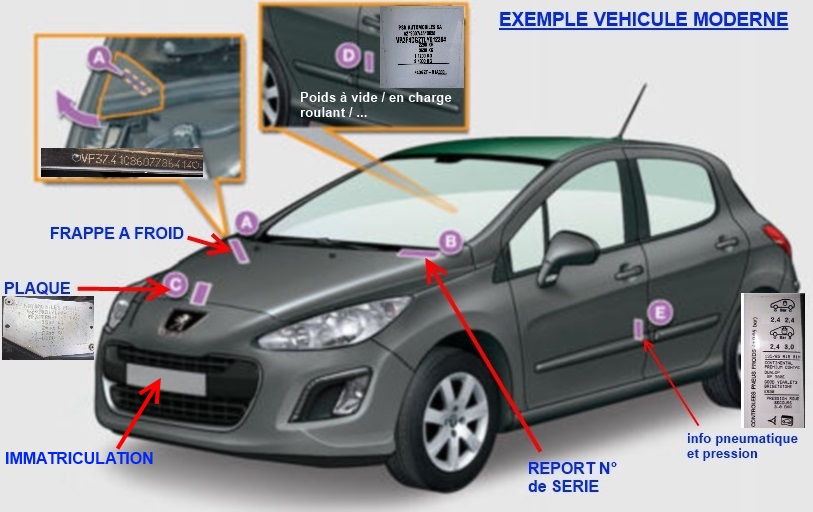- La frappe à froid du numéro de série sur une partie inamovible du véhicule. - La plaque de type reprenant entre autres le numéro de série et le N° d'homologation COC Européen le cas échéant ( Certificat of Conformity ). Soit plaque rivetée soit autocollant. - L'immatriculation dans le systéme du pays concerné en fonction de sa date de fabrication ( immatriculation France anciens FNI - SIV , immatriculation Europe) . - Le report visible du n° de série soit en bas de baie de parebrise ou sur autocollant feuillure de porte. - Les informations pneumatiques dimensions et pressions d'usage. |