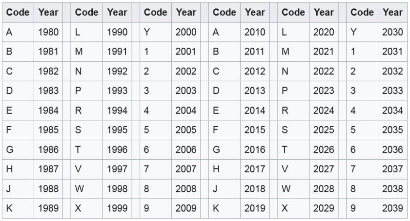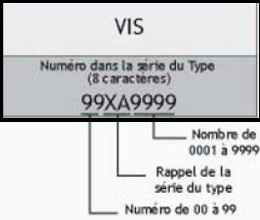 Le VIS Véhicule Identification Section est composé de 8 caractéres. Le 1er caractére donne l'année de construction, puis les autres donnent le type et le n° d'ordre ( le 10éme, le 100éme,.. ). | ![]() |
