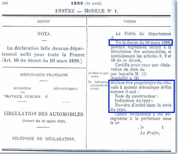 | Dés 1899 on organise quand même un minimum d'information pour pouvoir identifier et immatriculer un véhicule. | ||||||||||||||||||||||||||||||