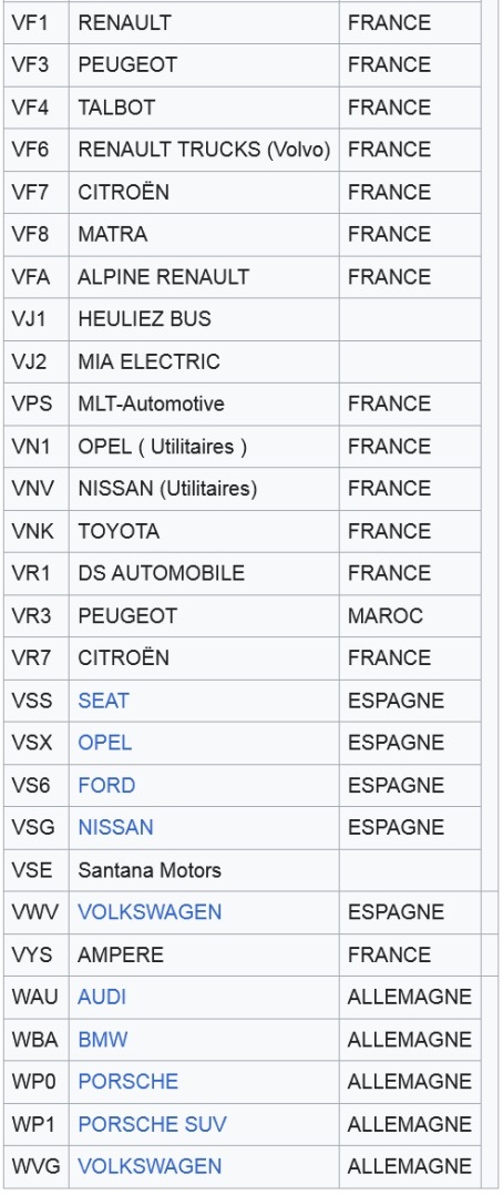 Il donne la région du monde, puis le pays , enfin le constructeur. Le 1er caractére donne la partie du monde : 1 USA , 2 Canada, V une partie de l'Europe... le 2éme donne le pays dans cette région ( le siége social pas le pays de construction) , puis le 3éme donne le constructeur lui même. Ainsi le VF et VR concerne la France : VF1: Europe-France-Renault , VF3: Europe, France-Peugeot,... |