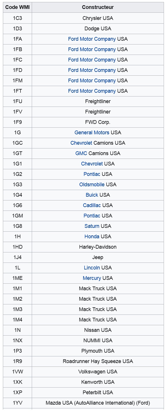 Aux USA on l'appelle VIN ( Véhicule Identification Number : numéro d'identification véhicule ) et parfois sérial number ( n° de série). Pour les modernes à partir de 1981 ils répondent à la même norme mondiale que les Européennes, numéro de série à 17 caractéres (voir plus haut). Pour les plus modernes il est visible derriére le pare-brise sur le tableau de bord. Le WMI : pour les USA comprend le code pays (1) puis le code constructeur G pour GM, F pour FORD, C pour CHRYSLER, D pour DODGE, enfin de la marque dans le groupe d'ou 1G1 pour GM Chevrolet, 1G2 pour GM Pontiac,1G3 pour GM Oldsmobile , etc.. Le VIN américain n'est pas qu'un simple numéro, le VDS et le VIS donnent les équipements de sécurité, le modéle précis, la version de moteur parfois la version de boite mais aussi l'année, l'usine d'assemblage et même bien plus. |