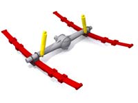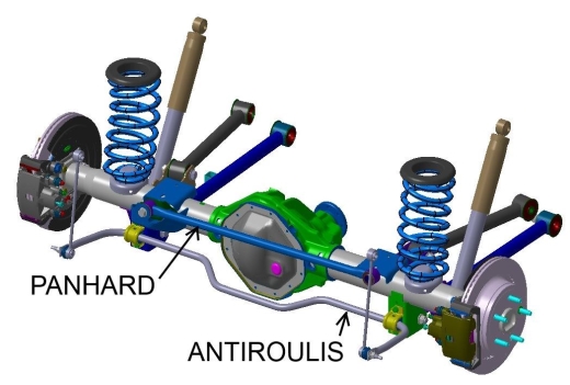 | Le guidage sur pont rigide peut être amélioré par une barre anti-roulis (maintien haut-bas) et/ou une barre panhard (maintien gauche-droite), ou bien encore un parallélograme de watt ( centrage). | |||||||||||||||||||||||||