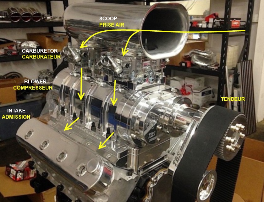| Le principe est encore utilisé sur les moteurs à carburateur américain , route ou compétition. La technique à évoluée blower soit à lobes ( roots) soit à vis ( twin srew). On a aussi du compresseur centrifuge appelé supercharger , une aube centrifuge . | ||||||||||||||||||||||||||||||||||||