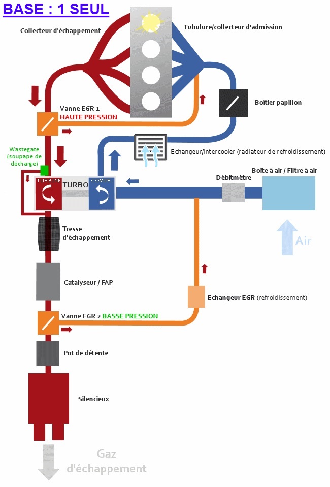 A la base un turbo était la norme . Inséré dans tous les autres dispositifs dont dépollution EGR, traitement des gazs catalytique, fap pour diesel,... . Puis sur des moteurs évolués on assiste au bi-turbo, 2 turbos fixes identiques , un par banc de cylindre. Passage au Twin-turbo : un petit et un gros fixes travaillant de concert mais à des plages de régime différentes ( l'avant turbo variable). Et l'usine à gaz le Tri-turbo : 2 petits variables et un gros fixe. (Exemple BMW). |