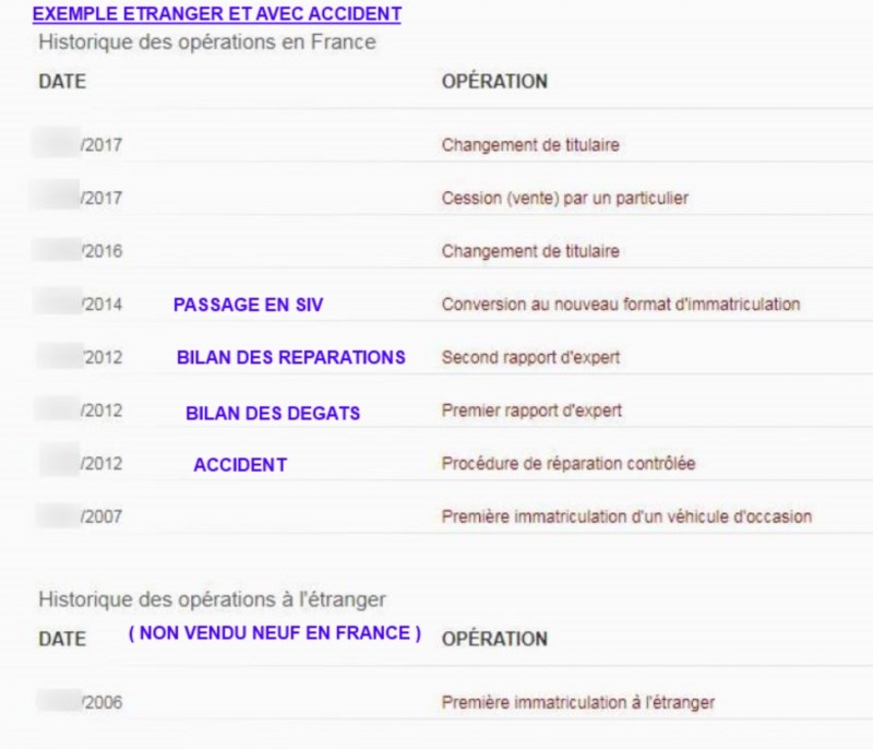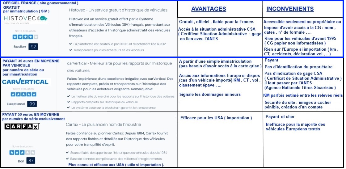 | Dans le cadre d'un futur achat soit on fait confiance aux indications du propriétaire soit on vérifie l'historique du véhicule sur des bases de données. L'historique se recherche soit avec l'immatriculation ( données carte grise), soit par le n° de série. L'incontournable en France est bien sur le site gratuit du gourvernement: Histovec. Il en éxiste d'autres qui peuvent compléter la recherche pour l'étranger dont l'Europe (payants). Cependant certains payants ne sont pas trés précis ( comme autoviza vu sur le boncoin ) ou ne sont pas forcémént utiles ( Autodna / historiqueauto / Autorigin / Vinspy / ..... ). Mais si on connait le pays d'origine on peut directement consulter les services gouvernementaux officiels d'historique pays par pays (tel que le Carpass belge). A tester et consulter en fonction du cas de figure ( France uniquement ou Europe ou USA ). Avec l'histovec on peut découvrir des problémes : un ancien gage, un ancien véhicule pro ( auto-école taxi, démonstration garage,... ), un ancien accident, ..... | |||||||||||||||||||||||||||||||||||||||||||||||