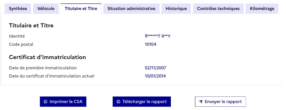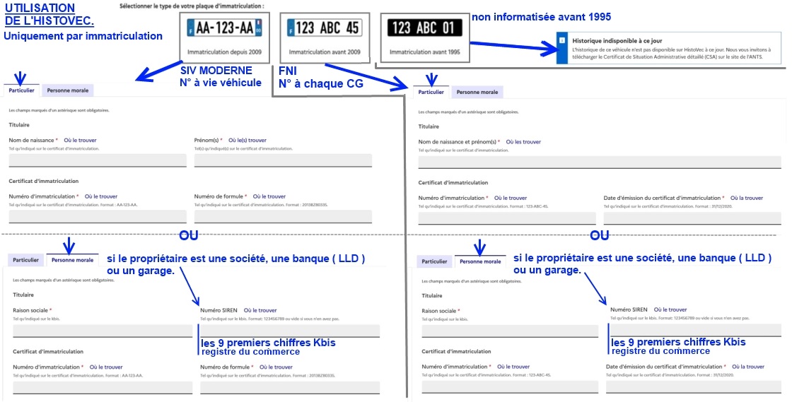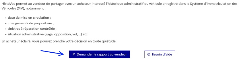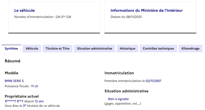 Depuis 2019 il est possible d'avoir gratuitement l'historique complet d'un véhicule immatriculé en France d'aprés les événements enregistrés en carte grise ( certificat d'immatriculation) et CT (contrôles techniques) avec le SIV (Systéme d'Immatriculation des Véhicules ) et l'ANTS ( Agence Nationale des Titres Sécurisés). Plus qu'un simple certificat de non gage ( CSA : Certificat de Situation Administrative), il donne nombre de changement de carte grise précédents, les éventuelles incohérences kilométriques, les éventuels accidents majeurs (si procédures avec expert) , les éventuels usages précédents (véhicule de démonstration garage, auto-école, taxi), son origine (si véhicule importé de l'étranger), les éventuelles modifications officielles (modifié officiellement en GPL ou Ethanol) , etc... Cependant en tant qu'acheteur on ne peut y avoir accés qu'avec les données de la carte grise ( voir avec le vendeur). Donc à la base l'Histovec c'est pour le propriétaire. De plus seuls les immatriculations d'aprés 1995 sont informatisées. Bref : si vous êtes le propriétaire ou si vous êtes acheteur avec les informations de la carte grise ( certificat d'immatriculation ) cliquez sur propriétaire. |