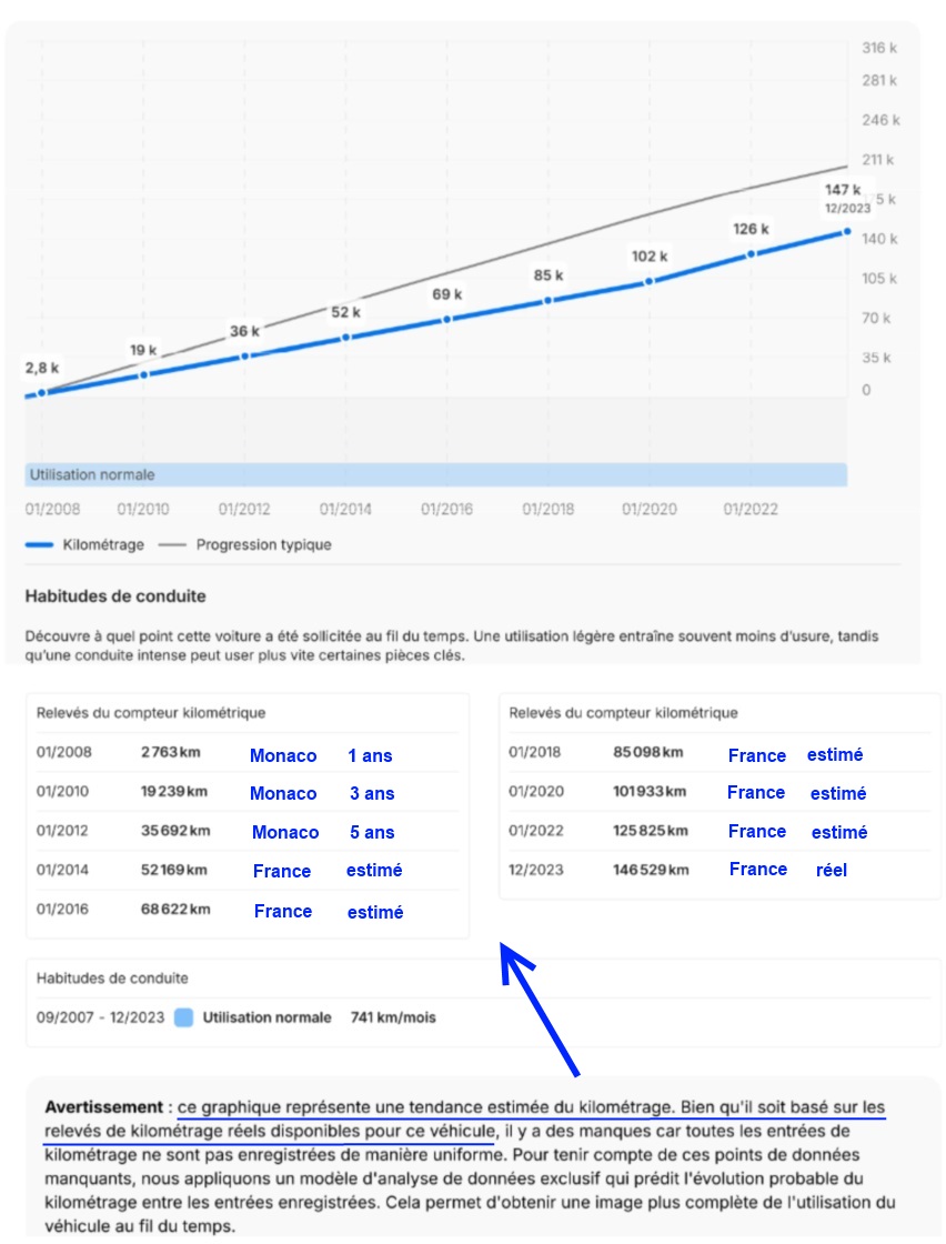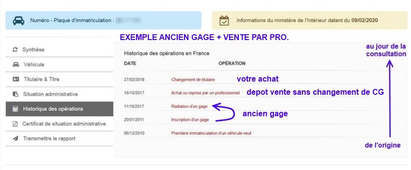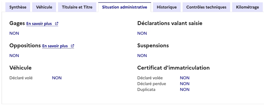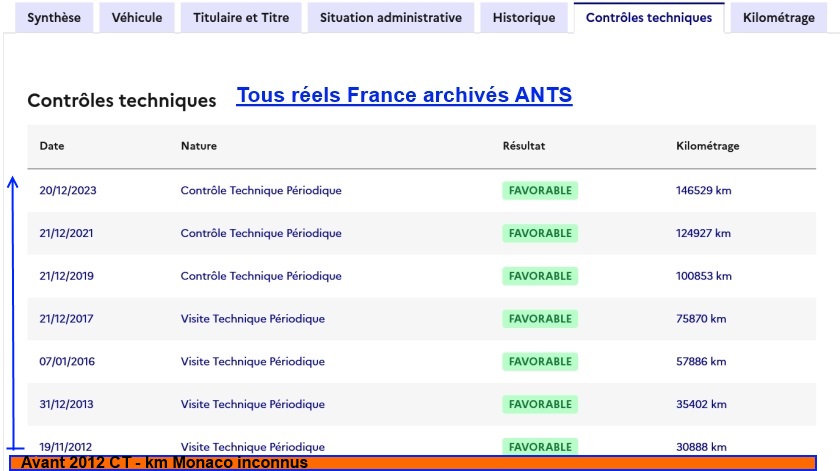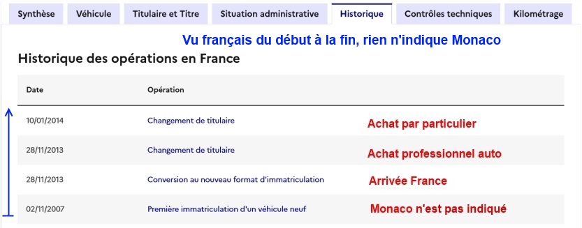 -pas vue importée juste vue conversion de format d'immatriculation à l'entrée en France ( lien réglementaire avec Monaco). - identification du propriétaire connue. - situation administrative et juridique compléte France ( gage, saisie, épave, ... archivés par l'ANTS ). - historique kilométrages issu seulement des CT Français ( uniquement archivés ANTS ). Pas de valeurs pour Monaco ( manque dans l'historique ). |