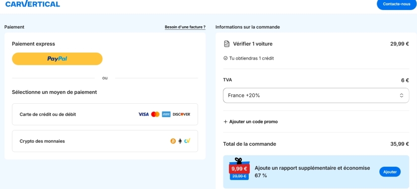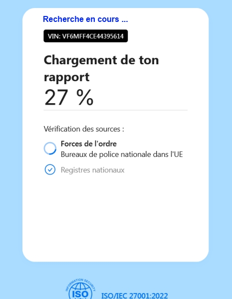 Car-vertical peut compléter l'historique d'un véhicule vu importé par Histovec sans désignation de pays ( par exemple frontaliers Belgique, Allemagne, Espagne, .. ). A partir d'une simple immatriculation on peut avoir un rapport même si on peut rechercher aussi par n° de série. Donc pas besoin d'accéder à la carte grise, l'immatriculation sur une simple photo d'annonce suffit. Malgré le coté payant il y a un gain de temps ( pas de délais d'infos par mail ou téléphone, pas de déplacements pour rien, consultation dans toute l'Europe en une seule fois). Petit inconvénient les multiples vérifications anti-robots de recherche internet par validation d'images (5 ou 6 d'affilés ). Bref : choisir une formule tarifaire, donné un mail pour l'envoi du rapport, cocher les vérifications de sécurité, payer la prestation, indiquer l'immatriculation ou le n° de série et lancer la recherche. Details dans 6-Comparaison |