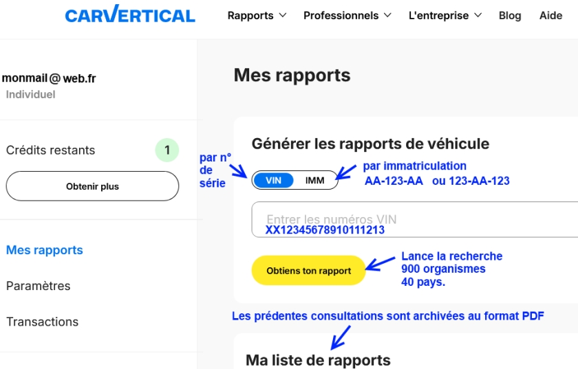 | 3-CAR-VERTICAL ( France et EUROPE ): DETAILS ET MODE D'EMPLOI POUR GENERER UN RAPPORT.