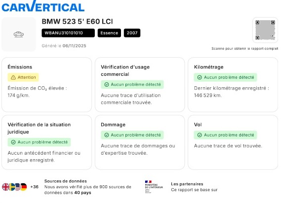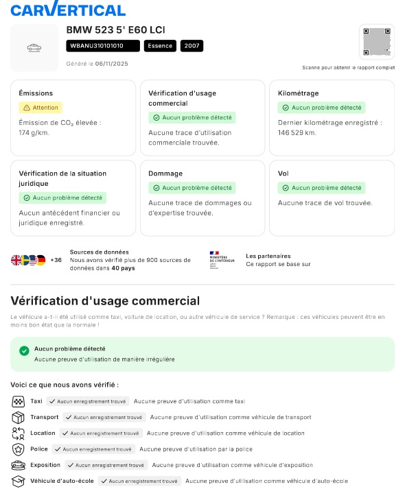 Pour l'exemple prenons une BMW de 2007 vendue neuve à Monaco et immatriculée d'occasion en France en 2014. Pour infos le contrôle technique à Monaco est généralement annuel. Pas directement considéré comme un pays étranger par la France ( conséquences historiques ), Monaco est réglementairement lié à la France avec des procédures simplifiées. Conclusion Histovec est déjà bien complet, Carvertical pour quelques infos hors de France, Autodna inutile. |