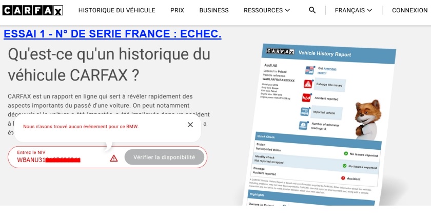 Pour l'historique d'un véhicule immatriculé France, la base incontournable est l'Histovec, à faire quel que soit le cas de figure car il est gratuit. Il est surtout adapté pour un véhicule 100% France (en France depuis l'origine, jamais importé/exporté) et d'aprés 1996 (limite numérisation des archives). Mais comme depuis 1996 avec le COC (homologation Europe) on peut acheter un véhicule en Europe et l'immatriculer en France, son historique étranger sera indisponible dans Histovec (entre 1ére immatriculation étrangére et importation France). Donc pour l'Europe le Car-vertical peut être adapté. Mais si on connait le pays Européen on peut consulter directement les services officiels d'historique étrangés concernés (tel le Carpass Belge). Pour un projet d'importation d'un véhicule depuis les Etats-unis l'Histovec comme le Car-vertical sont inadaptés. Pour les USA le Carfax est la base (créé aux USA en 1984). Certains payants se consultent en Anglais. |