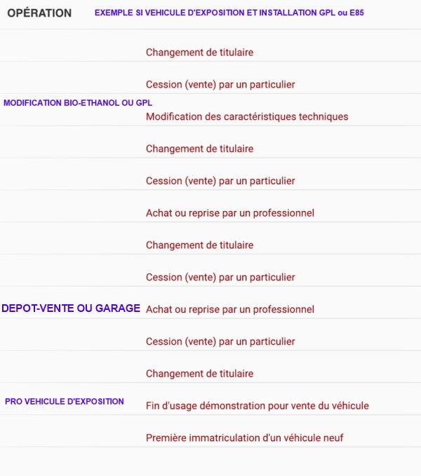 | En commençant avec un véhicule précedemment gagé / achat par pro. | Probléme d'usage démonstration garage / Validation adaptation légale de carburant. | Attention aux véhicules pro achetés Hors taxe. Si un particulier l'achéte la TVA est dûe par le pro. Par contre un véhicule de société n'a pas automatiquement été acheté HT.
