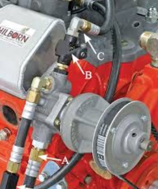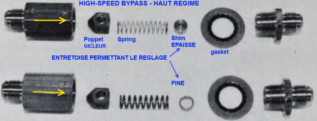 | Mais dans le cas des haut régimes le bypass principal sera grand ouvert et dépassé par le volume de la pompe continuant d'augmenter. Dans ce cas un bypass supplémentaire s'ouvre sur un seuil de pression pour évacuer le surplus de débit, le high speed bypass. Il comporte une entretoise interchangeable sur le ressort permettant de choisir à quelle pression il s'ouvre et un gicleur (Poppet ou Jet) dimensionnant le débit max évacuable. | ||||||||||||||||||||||||||||||||