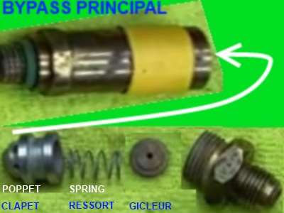 | Le bypass principal est une restriction controlée grace à un gicleur calibré (Poppet ou Jet), et une soupape de décharge grace à un clapet à ressort. Positionné à la sortie pompe vers bloc doseur : plus on purge plus la pression baisse, moins on purge plus la pression augmente. On crée une pression stabilisée du ralenti au 3/4 de régime moteur. Le gicleur est interchangeable et sa taille est choisie pour fournir suffisamment de débit carburant à pleine charge (WOP : Wide Open Throttle : pleine ouverture papillon). Chez Kinsler on peut même avoir un changeur de gicleur sans démontage : le Jet selector. | ||||||||||||||||||||||||||||||||