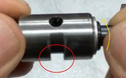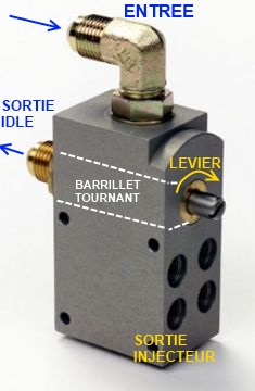 | A ce stade nous avons une ligne d'alimentation régulée. En suivant un robinet d'arrêt Shut-off valve permet de couper l'essence pour un arrêt moteur et aussi pour ne pas remplir tout le systéme à l'arrêt. Puis le plat de résistance,le Metering bloc ( bloc de dosage ) et son barillet tournant (barrel valve). Ce barillet, relié à l'accélérateur, tourne avec les tringles des volets d'air afin de synchroniser les volumes d'air et d'essence. Le barillet posséde un trou de purge calibré relativement grand pour le ralenti car on a pas besoin de beaucoup d'essence au ralenti mais comme il faut garder de la pression dans le systéme pour les injecteurs il y aura un bypass de ralenti avec clapet et gicleur le Idle bypass. Dans les phases autres que le ralenti c'est une encoche progressive qui s'ouvre vers les injecteurs pendant que le trou de purge du ralenti est refermé ( le bypass de purge du ralenti se refermera). Plus on accélére, plus le barrillet tourne, plus on envoie d'essence aux injecteurs par l'encoche. Quelques vues du dessus coté arrivée essence. | ||||||||||||||||||||||||||||||||