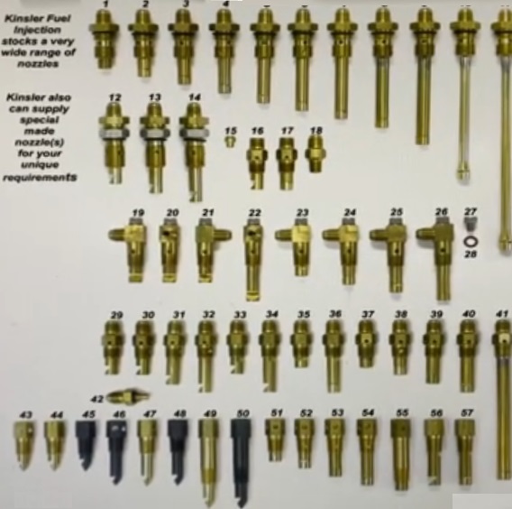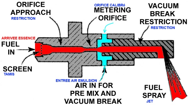 | La quantité d'essence est ensuite répartie sur les injecteurs (NOZZLE) , c'est une injection continue, seule la quantité d'essence change en fonction du régime moteur. Les injecteurs comportent une prise d'air d'émulsion avant le jet proprement dit. Autant de formes d'injecteurs que d'application possible. | ||||||||||||||||||||||||||||||||
