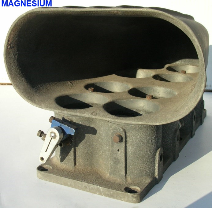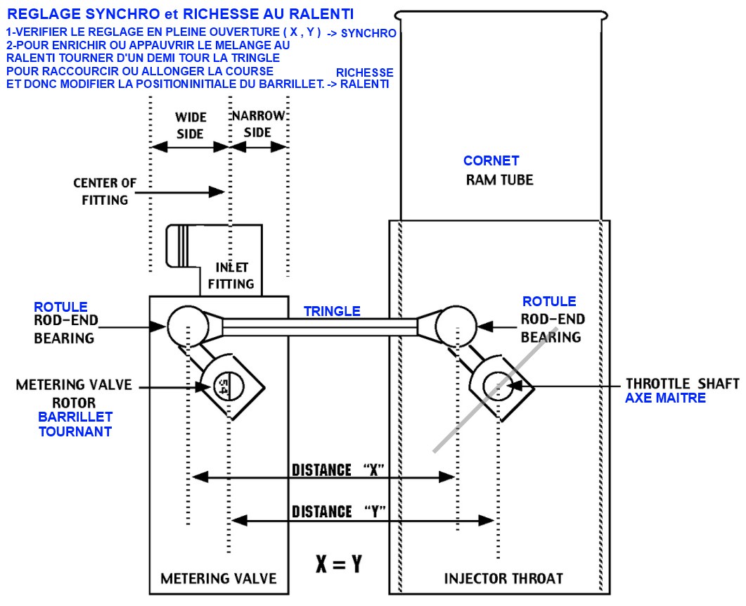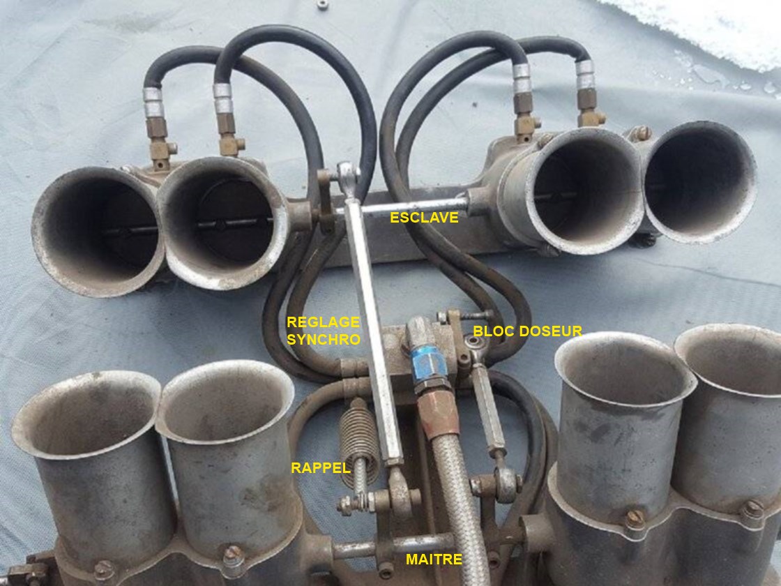 | Le collecteur d'admission, les cornets, quelques réglages : les cornets permettent d'avoir un flux d'air aspiré le moins perturbé possible. Pour les papillons il y a un banc maitre, un esclave relié par une tringle réglable pour la synchronisation et un renvoi au bloc de dosage. L'ouverture minimale de papillon se régle à la cale, la synchro papillon bloc doseur se régle d'abord puis la richesse au ralenti. | ||||||||||||||||||||||||||||||||