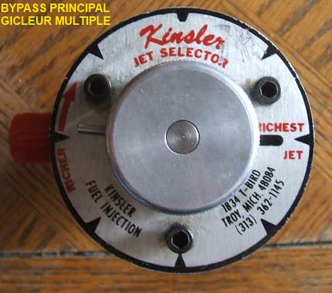 Innovation chez Kinsler : un bloc de selection pour le bypass principal. On peut changer de gicleur (JET) sans démontage, en changeant la purge principale on change la pression dans le systéme (jouant sur la richesse : plus riche Richer, plus pauvre leaner ).