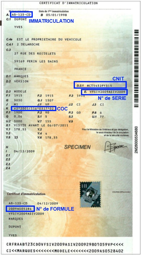 - On retrouve le numéro d'immatriculation en rubrique A , dans le systéme du pays concerné, ici France. - En rubrique E le numéro de série moderne à 17 caractéres. - En rubrique D2.1 s'y ajoute le numéro de type national CNIT spécifique à la France depuis 1994 ( Code National d'Identification du Type) qui remplace le type mines ( barré rouge). Géré par le CNRV (Centre National de Réception des Véhicules) : 12 caractéres depuis 1996 (FNI), 15 caractéres depuis 2009 (SIV). Reprends notamment les catégories Europe M, N, L .... (L moto et tricycles, N utilitaires , M voitures , ... ) - Tout aussi spécifique au systéme Français, à l'élaboration de la CG un numéro unique est apposé , le numéro de formule. Utile dans les recherches d'historique de véhicules avec la CG sur Histovec. Le n° est apparu avec le systéme SIV de 2009 ( Systéme d'immatriculation des Véhicules) qui a remplacé l'ancien systéme FNI (Fichier National des Immatriculation). - En rubrique K on retrouve depuis 1996 le N° COC d'homologation Européenne permettant d'acheter un véhicule quelque soit l'endroit en Europe. - Dans d'autres rubriques on y retrouve les différents poids ( masses) indiqués sur le véhicule. - Bien sur il doit y avoir concordance entre la CG et le marquage sur le véhicule. |